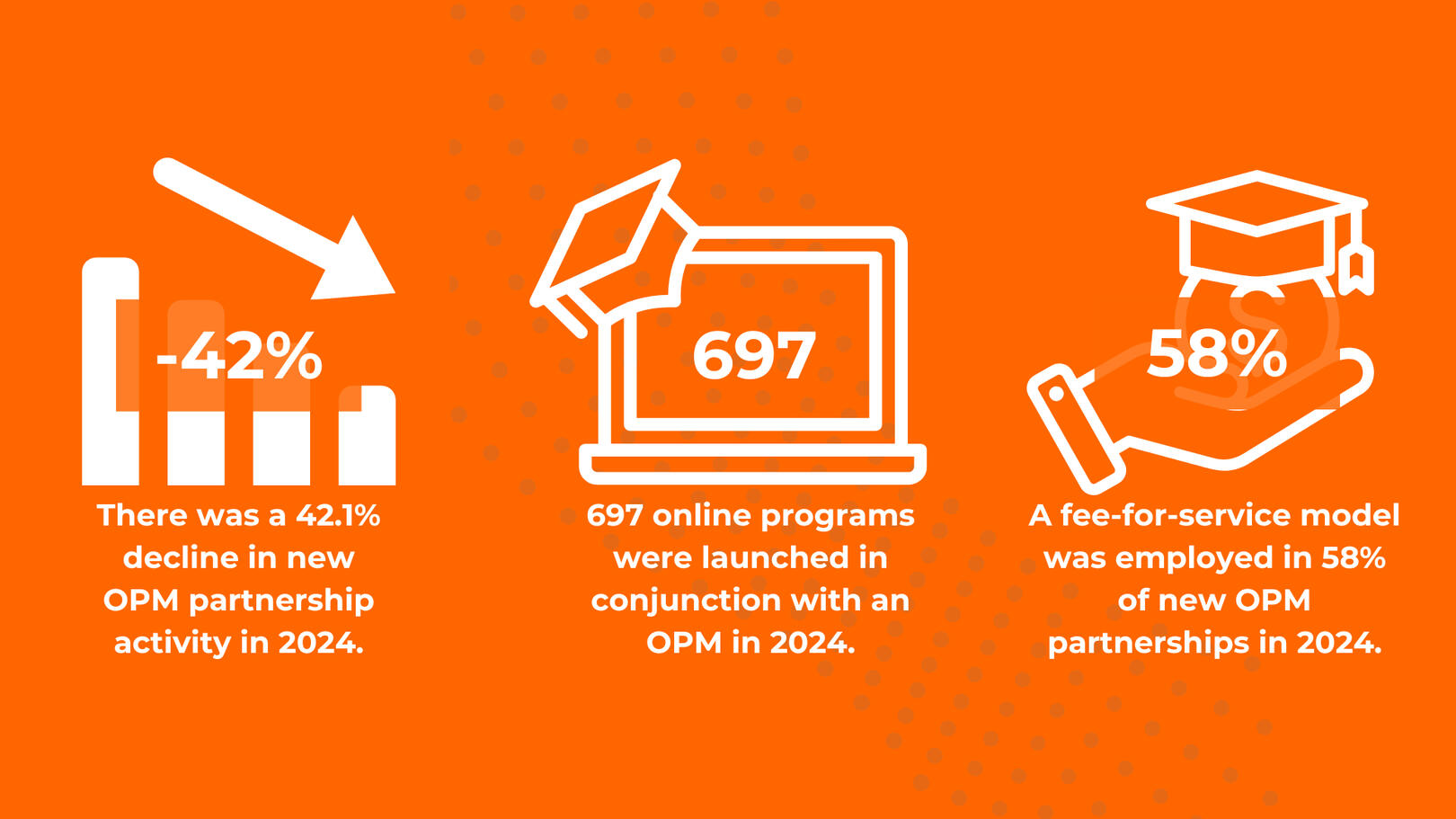 New partnership activity and new program launch activity declined to levels not observed in a decade.The second half of 2024 saw a slight rebound in new partnership activity compared to the first half of 2024. Even with the slight improvement, new OPM partnership activity ended 2024 down 42.1% year-over-year. Ultimately, 2024 saw just 81 new OPM partnerships initiated, a reversion back to levels not seen since 2016/17. New program launches were also down in 2024. For the full year, 697 new online degree or certificate programs were launched, roughly the same amount as was observed in 2015.The fee-for-service model final surpasses the revenue sharing model.While new partnership activity was down 42.1% year-over-year, there was a type of partnership that actually observed growth, and that was partnerships of the fee-for-service variety which grew 2.2% year-over-year. This model has surpassed revenue sharing as the main type of revenue strategy employed, as 58% of new partnerships established in 2024 were of the fee-for-service variety. This makes 2024 the first year on record where fee-for-service partnership activity surpassed revenue sharing partnership activity.The MBA remains the darling of OPMs.In January we published our MBA Market Report, in which we noted that while the online MBA market is indeed substantially large and growing, it is also getting very saturated. This growing saturation is causing average program sizes to decline. In spite of this, the sheer volume of students interested in this program has shown to be too appealing to pass up, as the MBA was once again the most popular online program launched by universities in conjunction with an OPM partner. The second most popular program launched by universities in conjunction with an OPM in 2024, however, was a Certificate in AI/ML.There are new market leaders in the OPM space.After publishing our previous OPM report and receiving public comments, we've updated our OPM Market Map. In addition to this updated graphic, we find that Risepoint (formerly Academic Partnerships) is now the leading OPM provider in the United States representing 11.9% of all OPM partnerships and 30.5% of all OPM-supported programs in 2024.